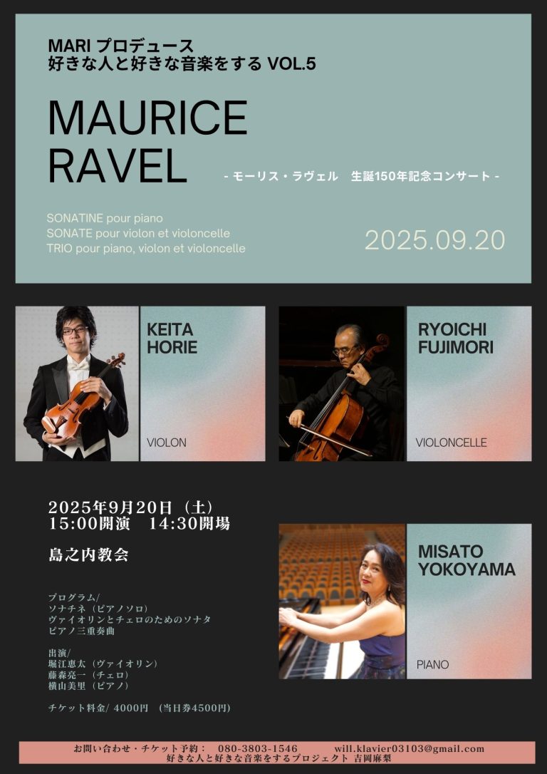 たくさん室内楽のコンサートをやっています。 恒例の室内楽セミナー&コンサート、大阪の会は大盛況のコンサートをもって終了しました。横浜の会の発表コンサートは11月30日サーラマサカにて開催します。レッスンの聴講も可能です。お問い合わせください。 横山美里 Misato yokoyama Upcoming Concerts Mari プロデュース 好きな人と好きな音楽をするVOL.5 モーリス・ラヴェル生誕150年記念コンサート 2025-9-20 島之内教会(大阪市)15:00開演 The Grand Trio 珠玉の室内楽 2025-9-28 代官山ヒルサイドテラス・ヒルサイドプラザ15:00開演