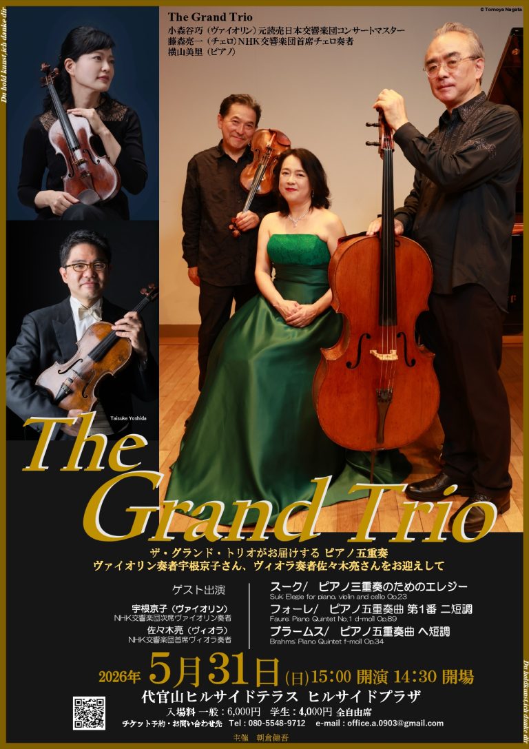 毎年恒例のThe Grand Trio代官山ヒルサイドテラス公演ですが、今回はゲストお二人をお迎えしてピアノクインテットの編成でお届けします。どうぞお楽しみに!